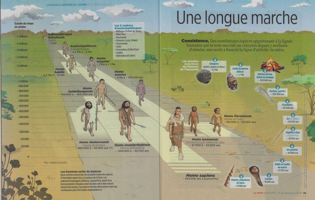 A caminhada da evolução começou com o Australopiteco há três/quatro milhões de anos na África austral e de leste. De seguida surge o Homo habilis, cujo descendente mais recente é o Homo neandertal, que saiu de África e se dispersou pela Eurásia. Houve miscigenação desta espécie com o Homo sapiens e ainda hoje temos no nosso genoma uma percentagem de Neandertal de cerca de 3%, embora diferente nos vários continentes.